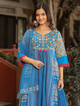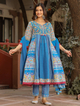 Indulge In Elegance With Our Sujani Blue Floral Print Cotton Kurta Set, Adorned With Delicate Embroidery. Paired With Matching Printed Pants And A Solid Net Dupatta, Its A Masterpiece Of Style And Sophistication.