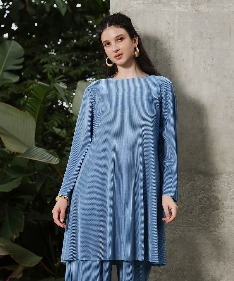 Qissa Womens Powder Blue Solid Pleated Kurta Set For Ethnic Wear | Round Neck, Long Regular Sleeves | Solid Pleated Fabric | 2 Piece Kurta Set Designed For Casual & Daily Wear