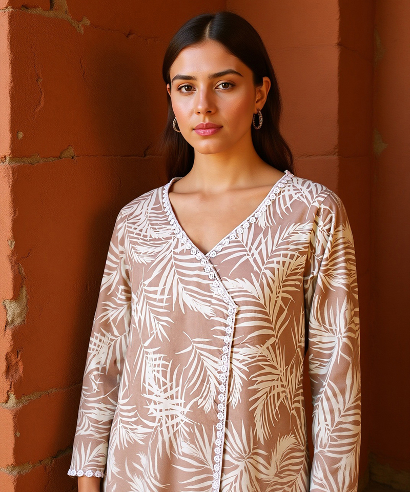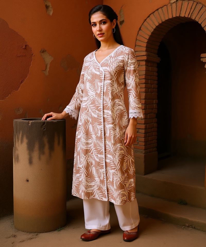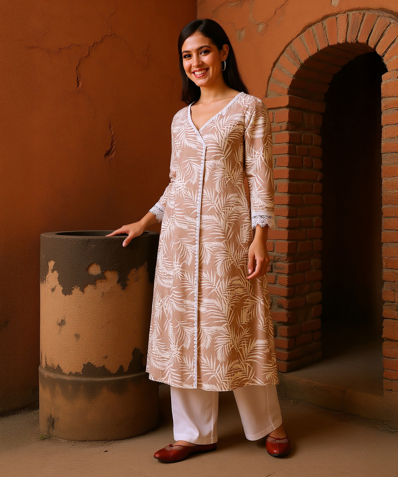Qissa Womens Saltbox Beige Soft Fern Kurta With Trousers For Ethnic Wear | V-Neck, Long Regular Sleeves | Floral Print Plain Fabric | 2 Piece Kurta Set Designed For Casual & Daily Wear