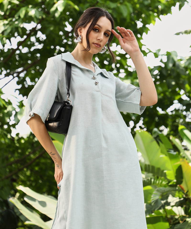Qissa Womens Powder Blue Solid Linen-Blend Kurta Set For Casual Wear | Spread Collar | Quarter Cuffed Sleeves | 2 Piece Kurta Set Designed With Comfort Fit For Everyday Ethnic Wear