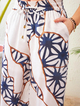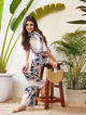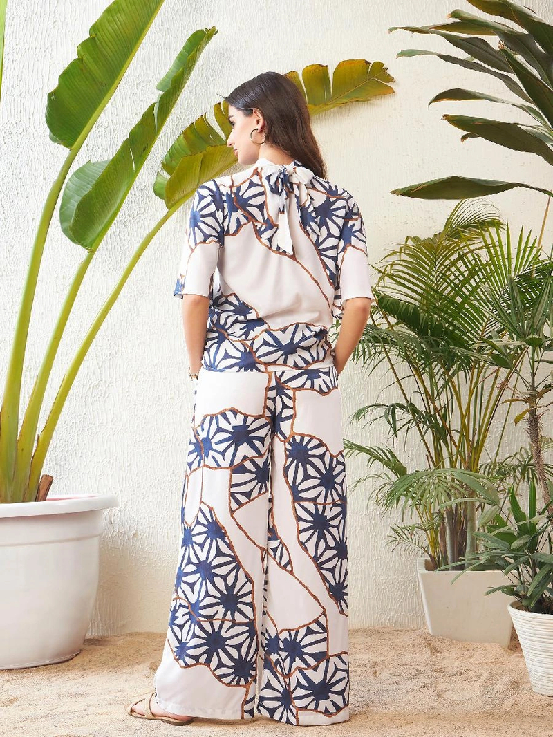 White Abstract Printed Top With Palazzo Pants, in Heavy Georgette fabric, Unlined, Regular Length, Comfort Fit, Button Closure/Slip On, Straight Hemline and features Flared Sleeves