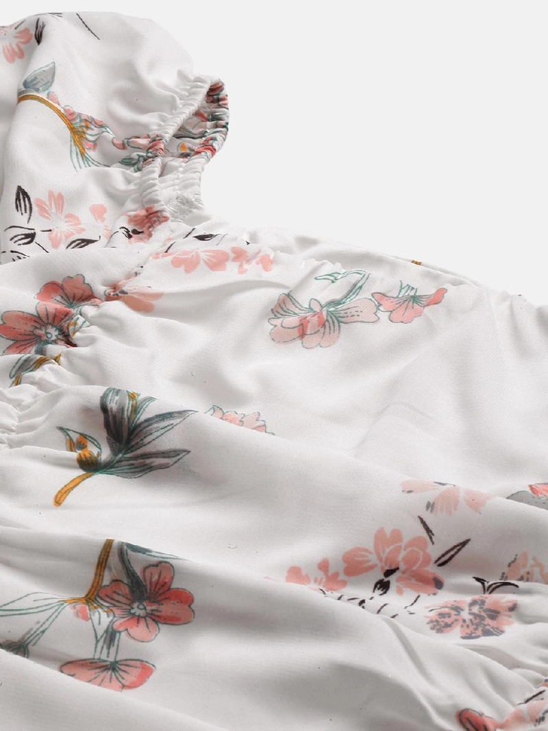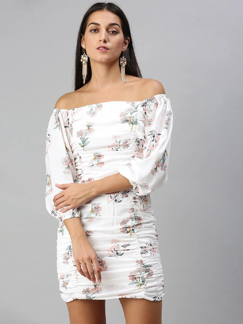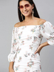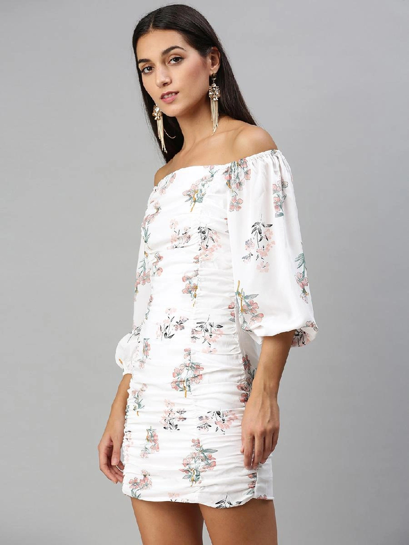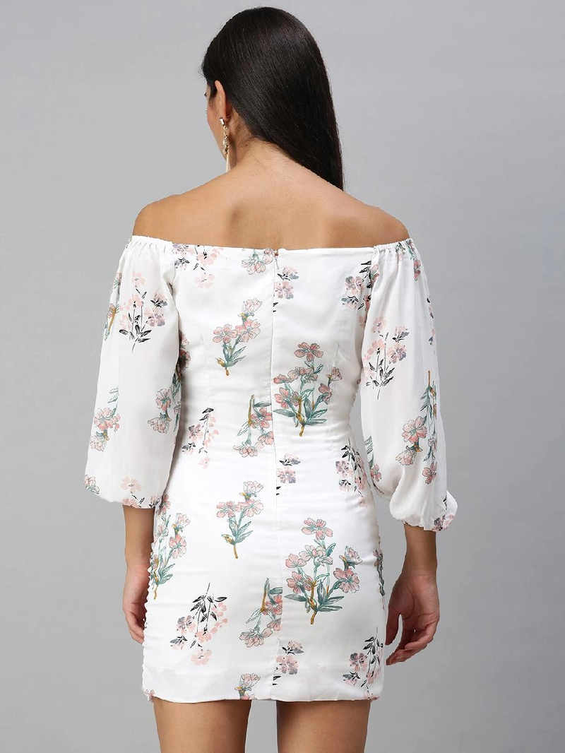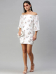 Product Details - A classic that will always stay in style, this dress is a must-have for every sophisticated woman. Designed with a chic floral print and off-shoulder design, this piece makes you look more alluring. Pristine white shade. Printed smocked dress. Classic off-shoulders. Stylish three-quarter puff sleeves. Above knee length.