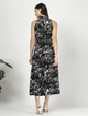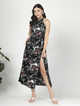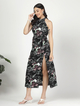 Printed halter neck maxi dress with tie up belt and slit detailing