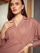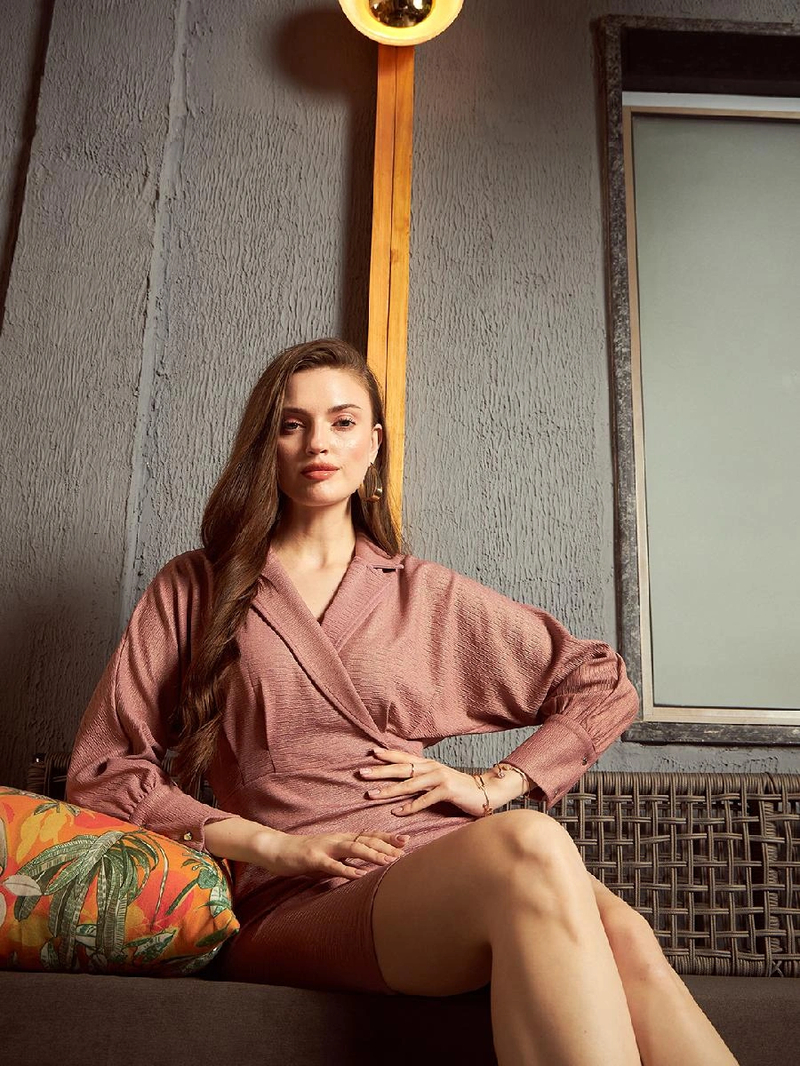 Product Details - Pink solid wrap dress, Shirt collar, Long, cuffed sleeves, Mini length in flared hem