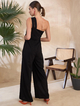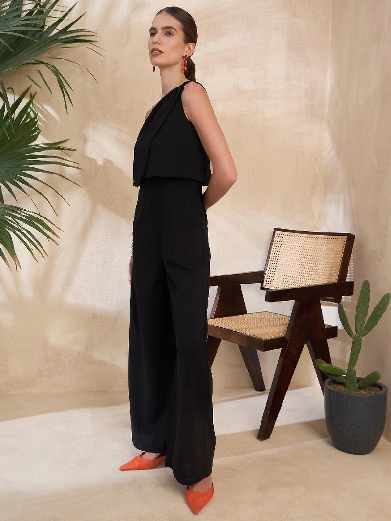 Product Details- Black solid basic jumpsuit ,has a one shoulder, sleeveless, 2 pockets, zip closure Material & Care 98% Polyester, 2 % Lycra Machine Wash Closure-Zip Fabric-Polyester Neck-One Shoulder Number of Items-1 Number of Pockets-2 Occasion-Casual Package Contains-1 jumpsuit Pattern-Solid Sleeve Length-Sleeveless Sustainable-Regular Type-Basic Jumpsuit Wash Care-Machine Wash