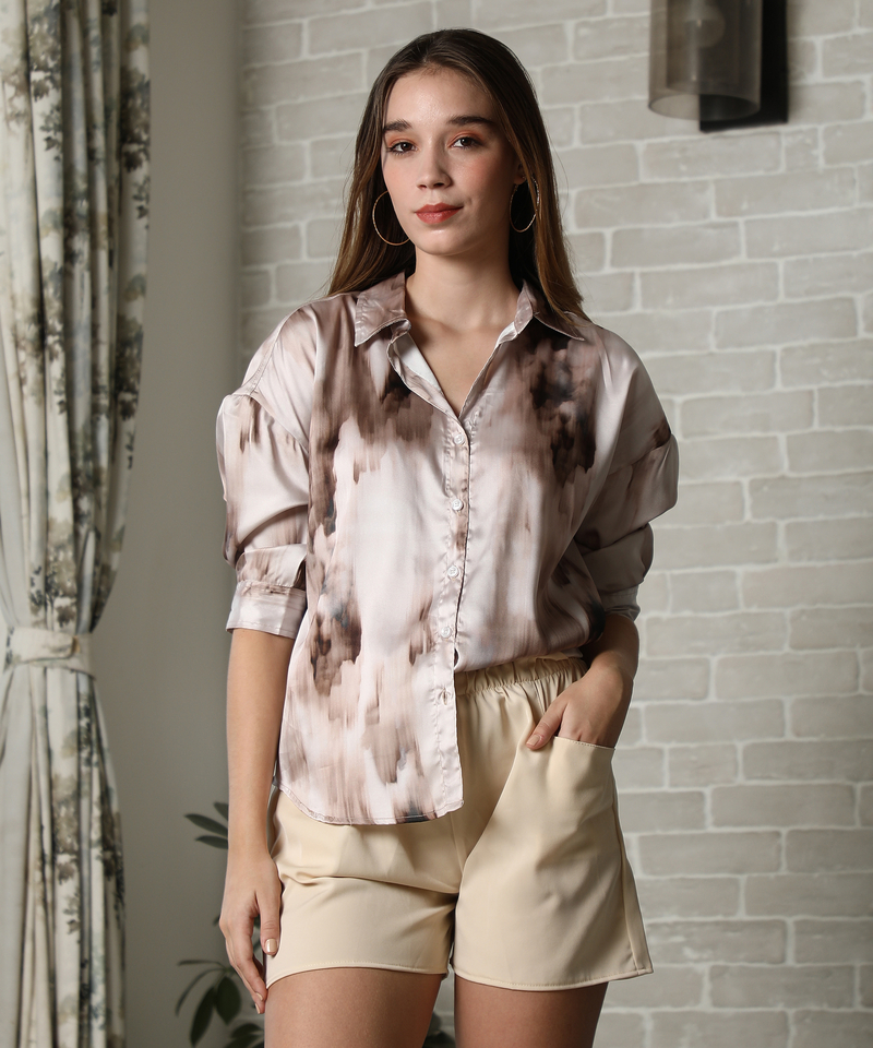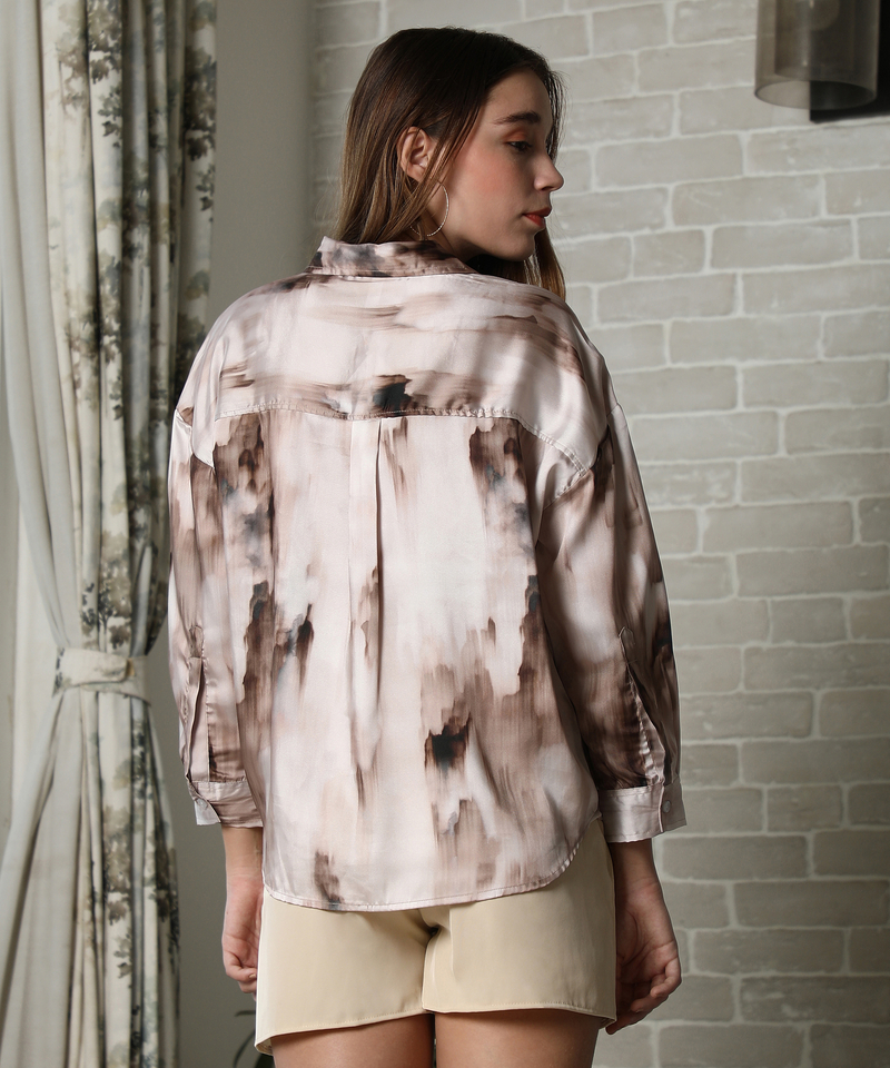 Pinacolada Womens Coffee Brown Stained Satin Oversized Shirt For Casual Wear | Spread Collar | Long Cuffed Sleeves | Button Closure | Oversized Shirt Designed With Comfortable Fit For Woman & Girls