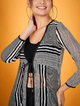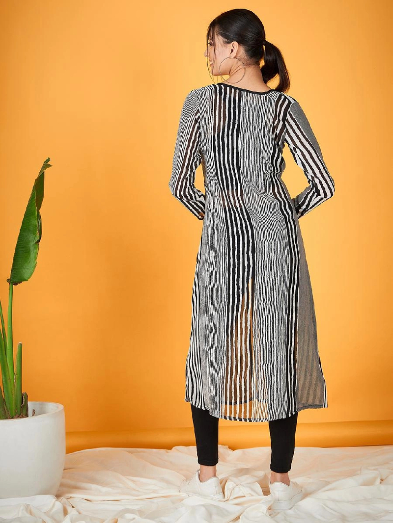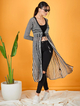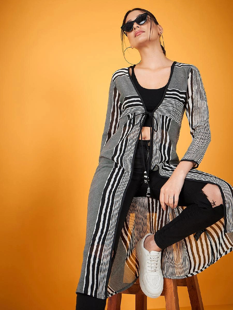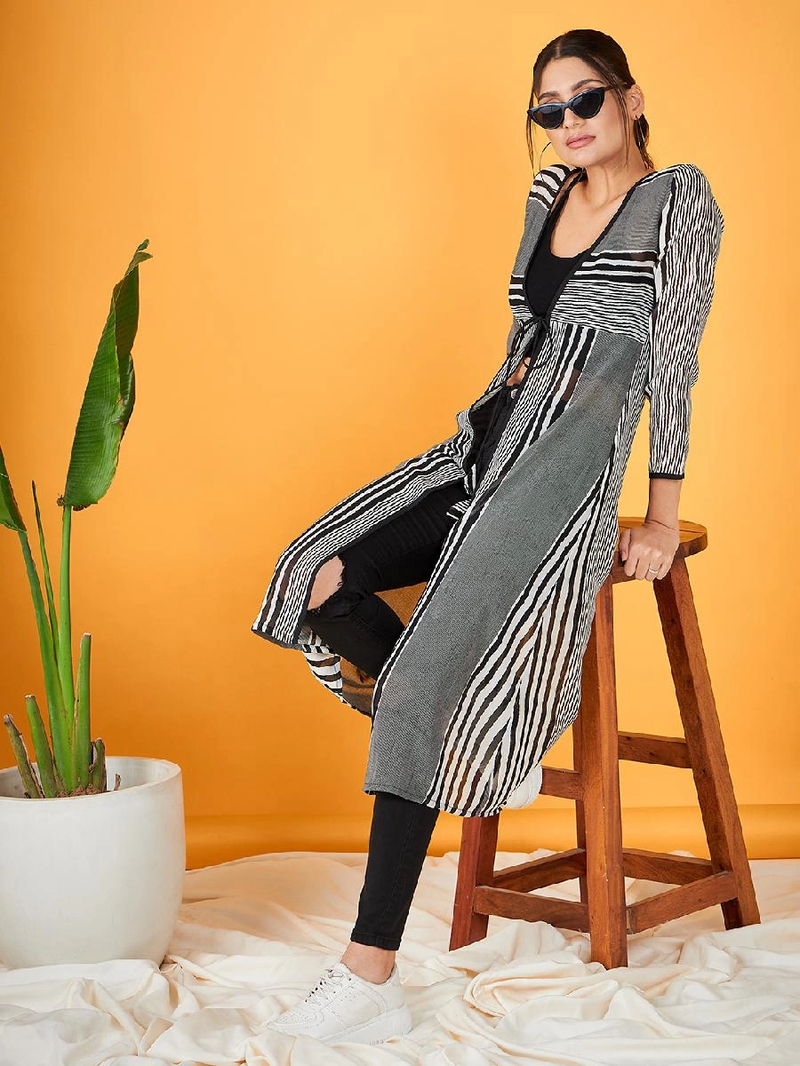 Product Details - Black and white printed tie-up longline shrug ,has long sleeves, straight hem