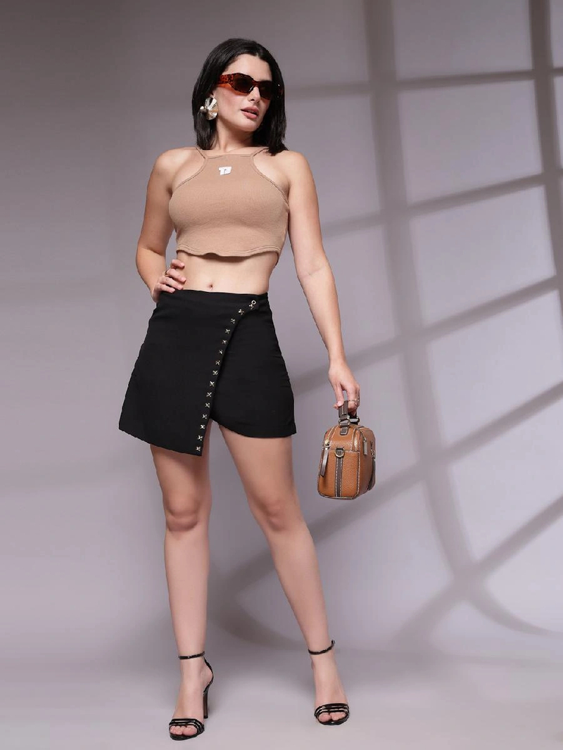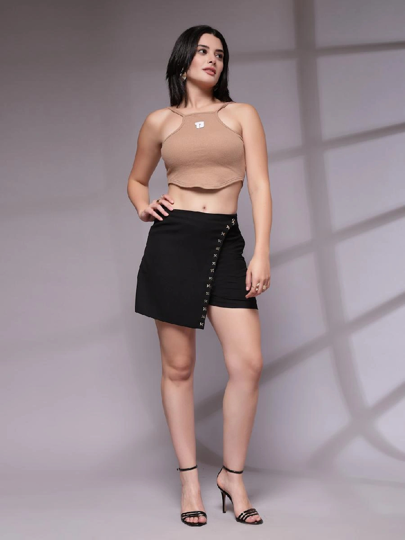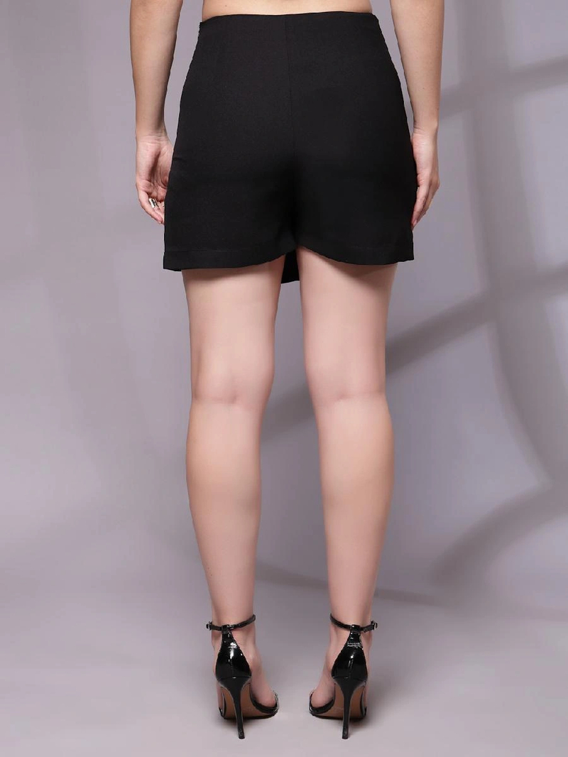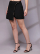 Product Details- Black solid overlap above knee length mini skort, has an elasticated waistband with zip closure Material & Care 100% Polyester Dry Clean Type-Skorts Length-Mini Print or Pattern Type-Solid Hemline-Straight Knit or Woven-Woven Closure-Zip Slit Detail-No Slit Transparency-Opaque Occasion-Casual