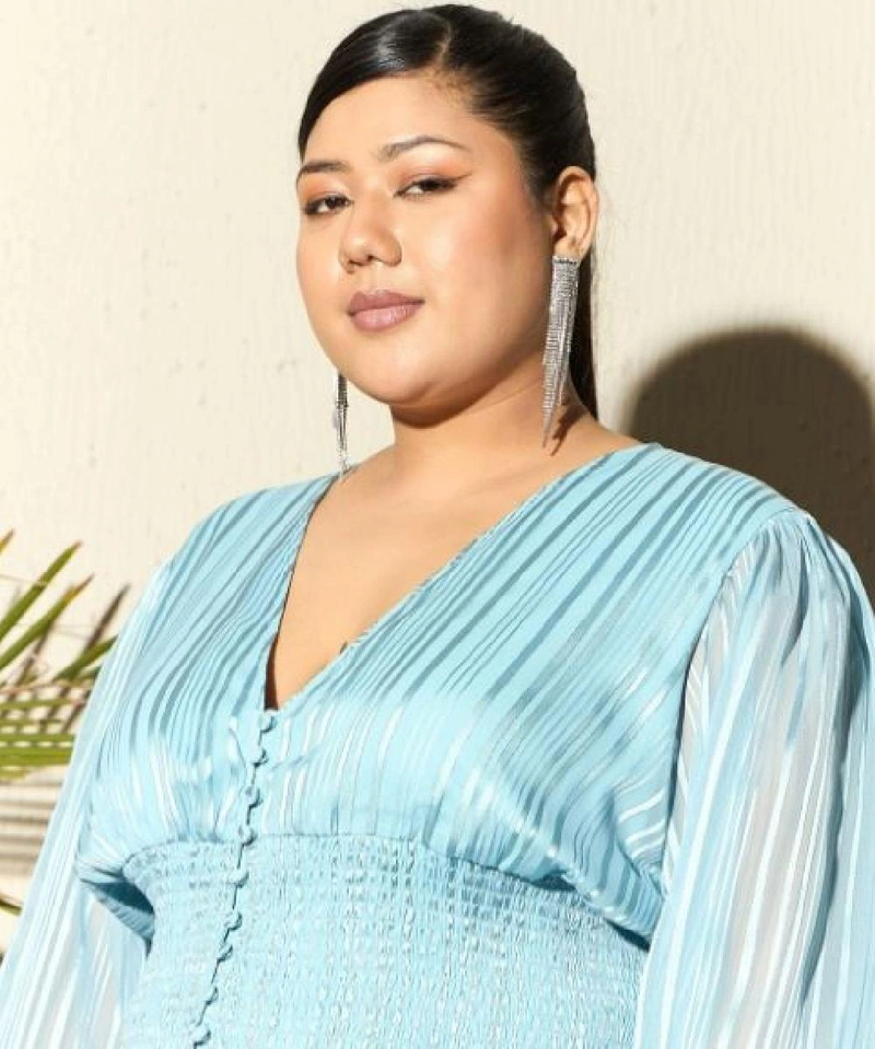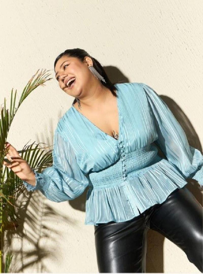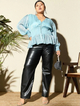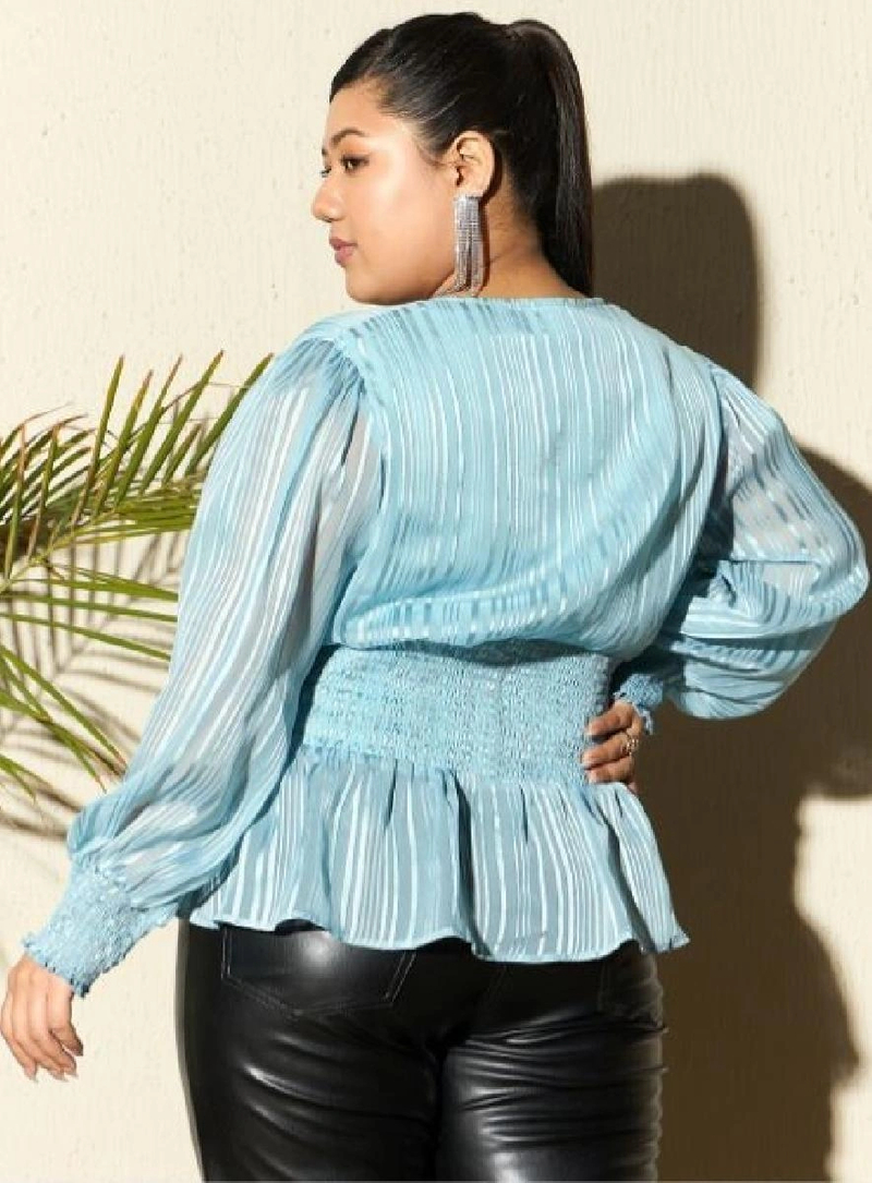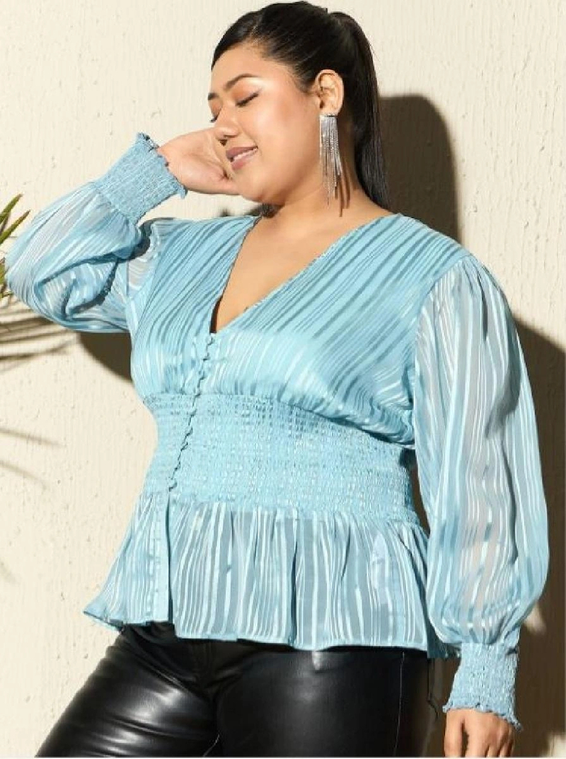 Product Details - Regular peplum top, Self designed, V-neck, Long, cuffed sleeves, Smocked detail, Woven georgette, Button closure