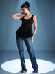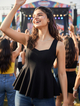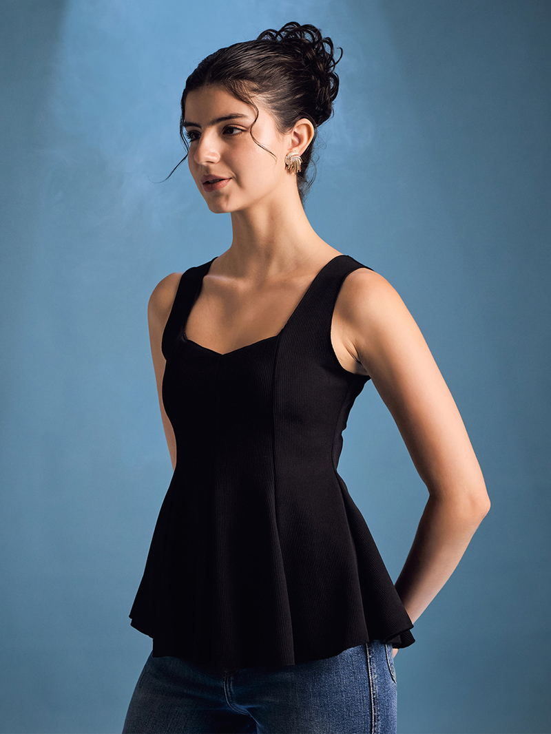 A chic blend of comfort and structure, this sleeveless ribbed peplum top is a wardrobe essential for effortless style. Crafted from soft ribbed fabric, it flatters the body with its fitted silhouette before flowing into a playful peplum hem. The sleeveless cut keeps it breezy and versatile, making it perfect for layering or wearing solo. Pair it with tailored trousers for a polished look, or style it with jeans and skirts for an easy day-to-night transition. Its timeless design ensures it works beautifully for both casual and semi-formal occasions.