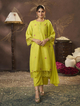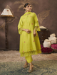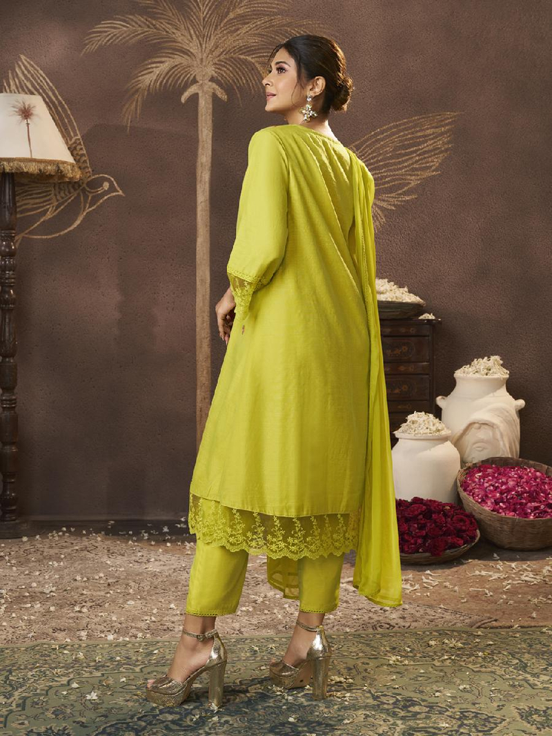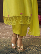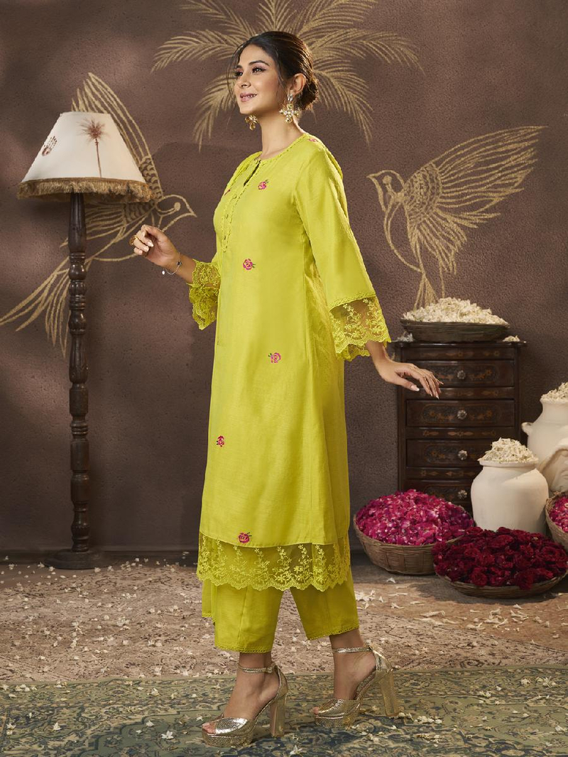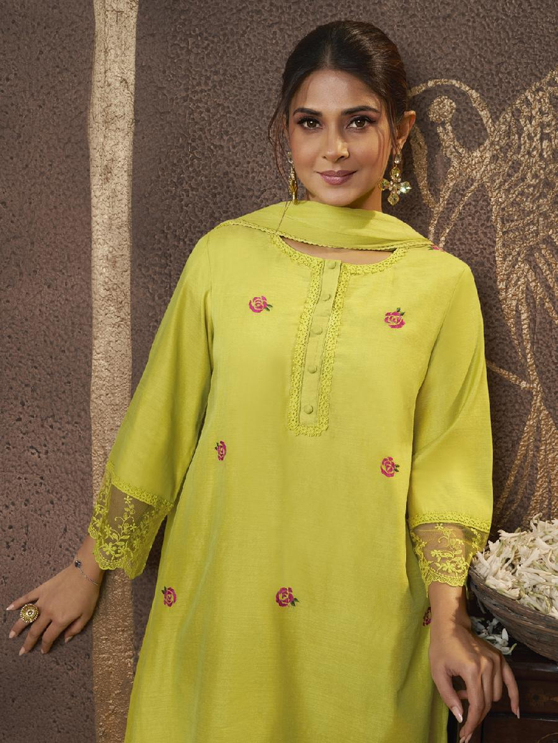 A line Embroidered kurta, round neck, calf length with straight hem & full sleeves, with lace detailing & plain plazzo elastic waistband with Lace details & also with Tapping solid Dupatta.