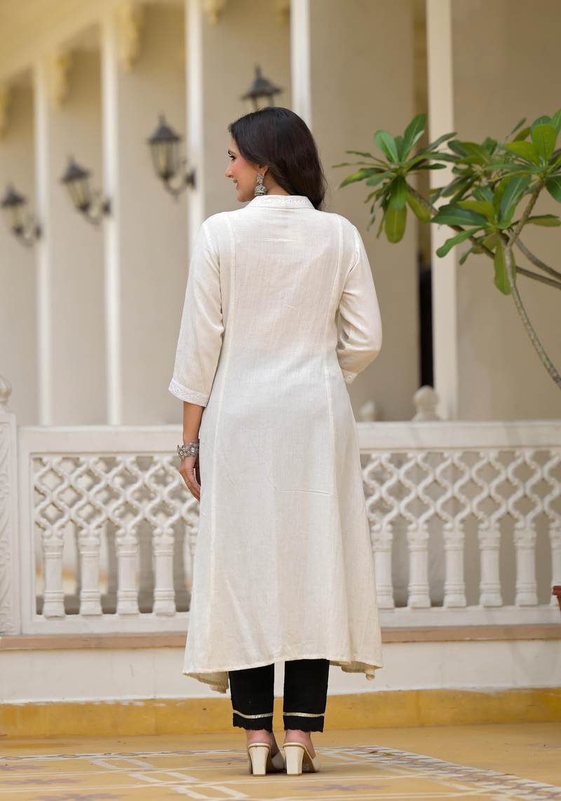 Off-White Solid Kurta with Mirror Work. This calf-length A-line kurta features a fit & flare silhouette, a V neckline, and three-quarter regular sleeves, perfect for a graceful look.