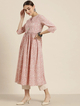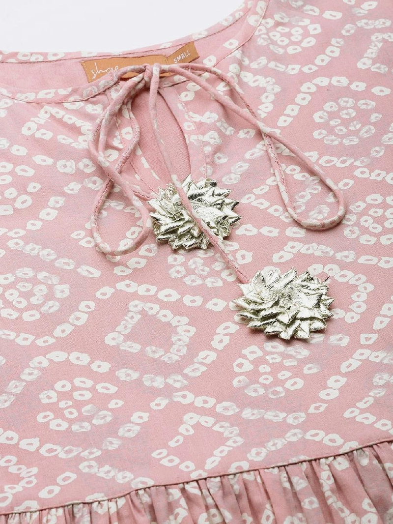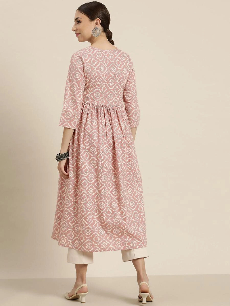 Mauve Bandhej Gathered Kurta, in Cotton fabric, Cotton Lining, Calf Length, Fit & Flare, No Closure, Straight Hemline and features Back Keyhole with Loop And Button