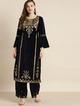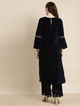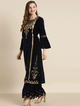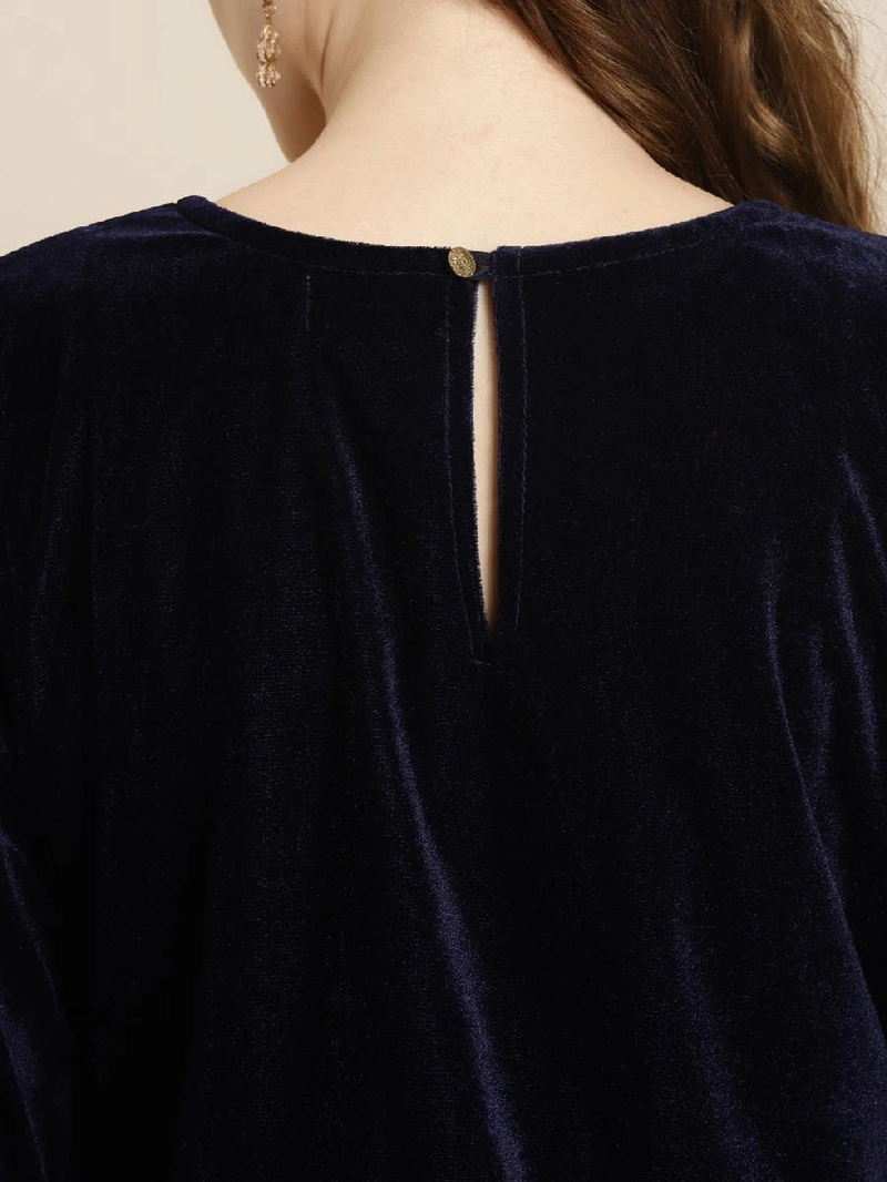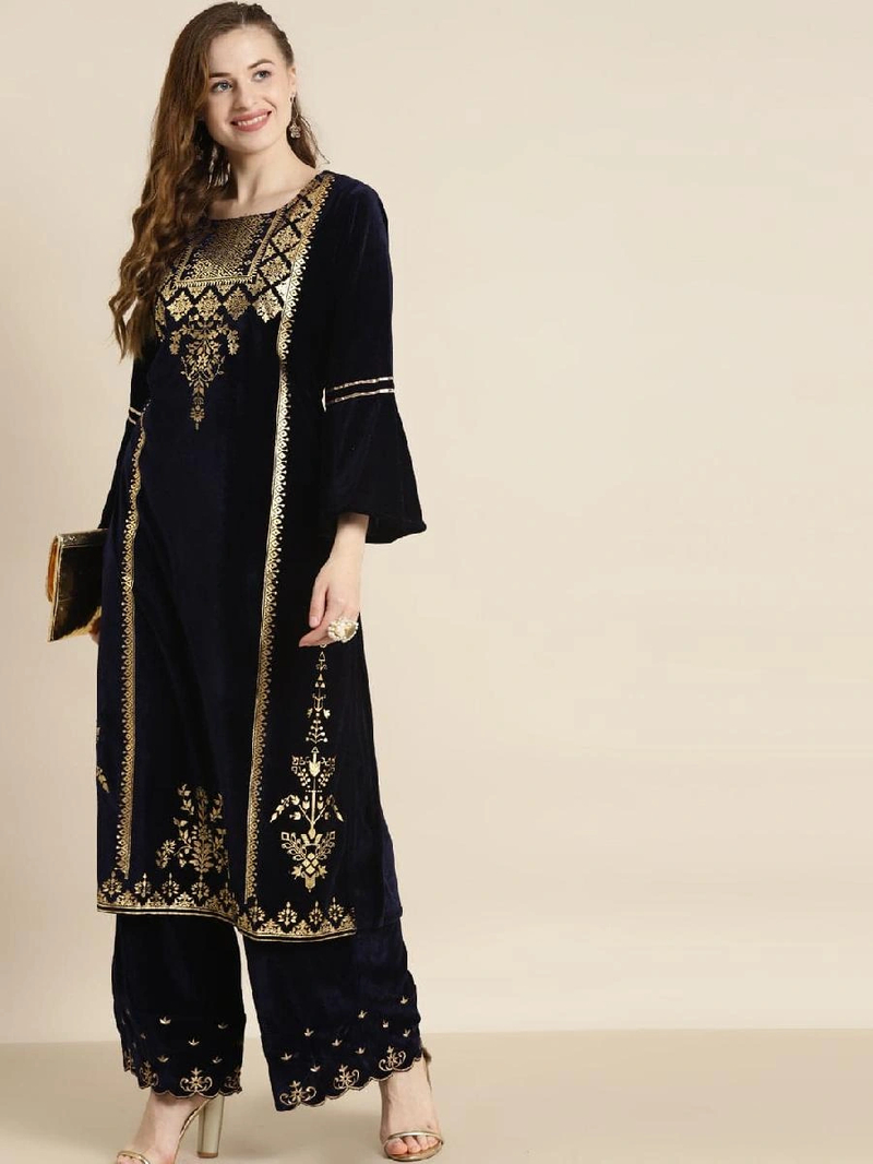 Navy Velvet Foil Print Flared Sleeve Kurta, in Velvet fabric, Cotton Lining, Calf Length, Straight Fit, NA, Straight Hemline and features Kinari Gota Details At Sleeve opening