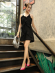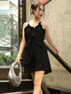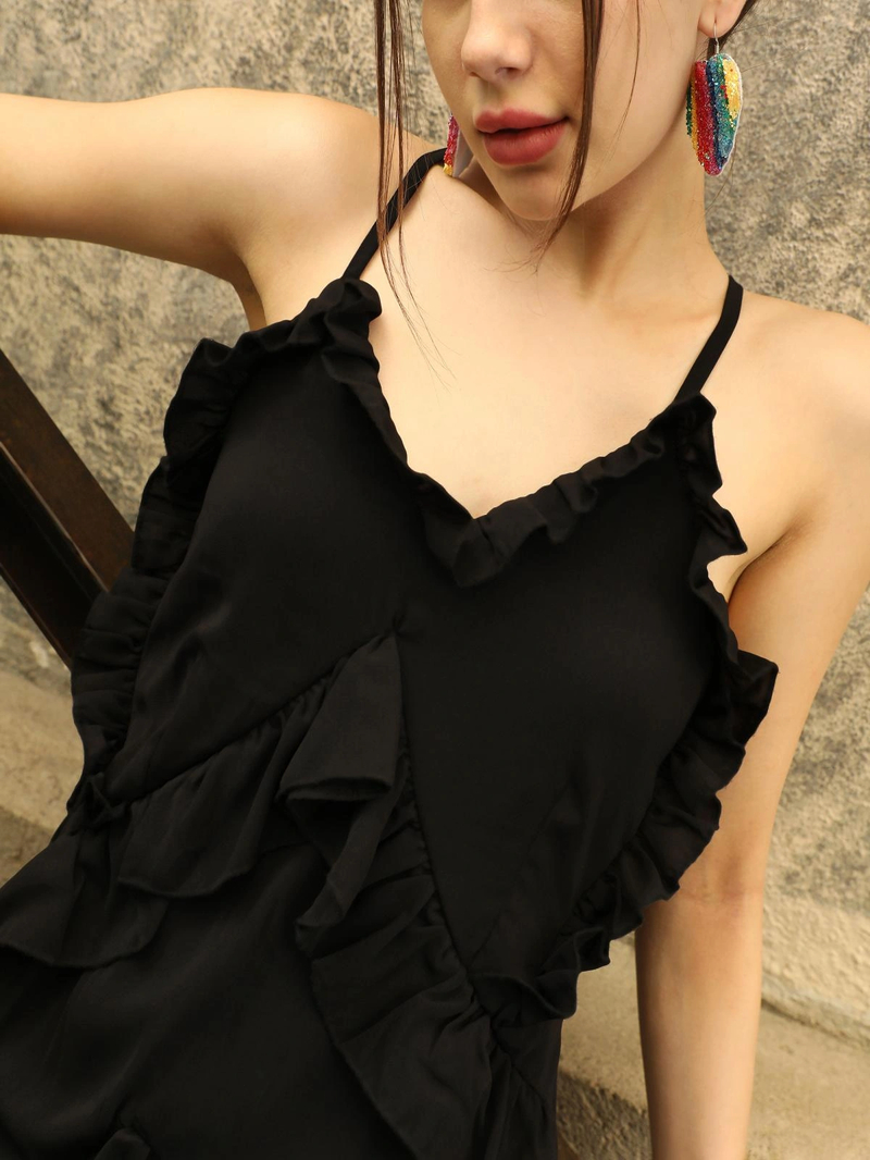Pinacolada Womens Midnight Black Ruffle Mini Dress For Casual Wear | V Neck | Spagetti Strap | Pull On Closure | Dress Designed With Comfortable Fit For Woman & Girls